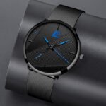 • Mesh belt black leather with black dial and blue needle